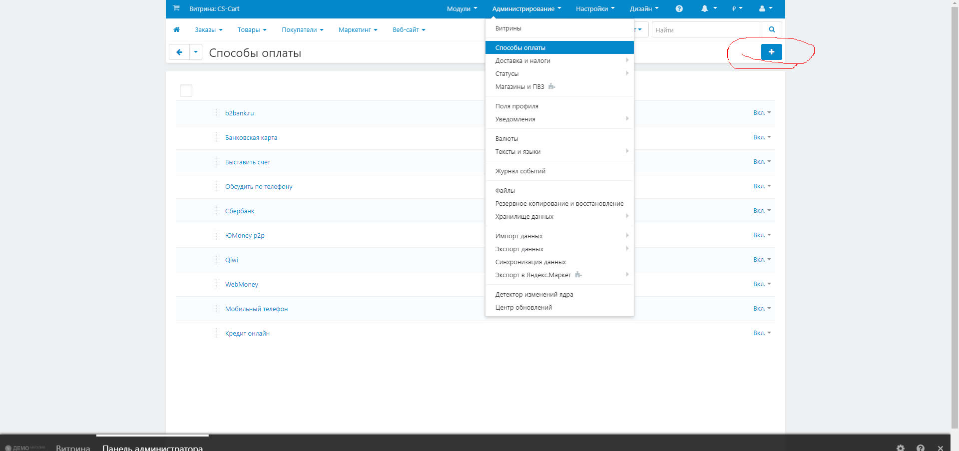 Перейдите в раздел Администрирование-Способы оплаты.Нажмите на кнопку - Добавить способ оплаты.