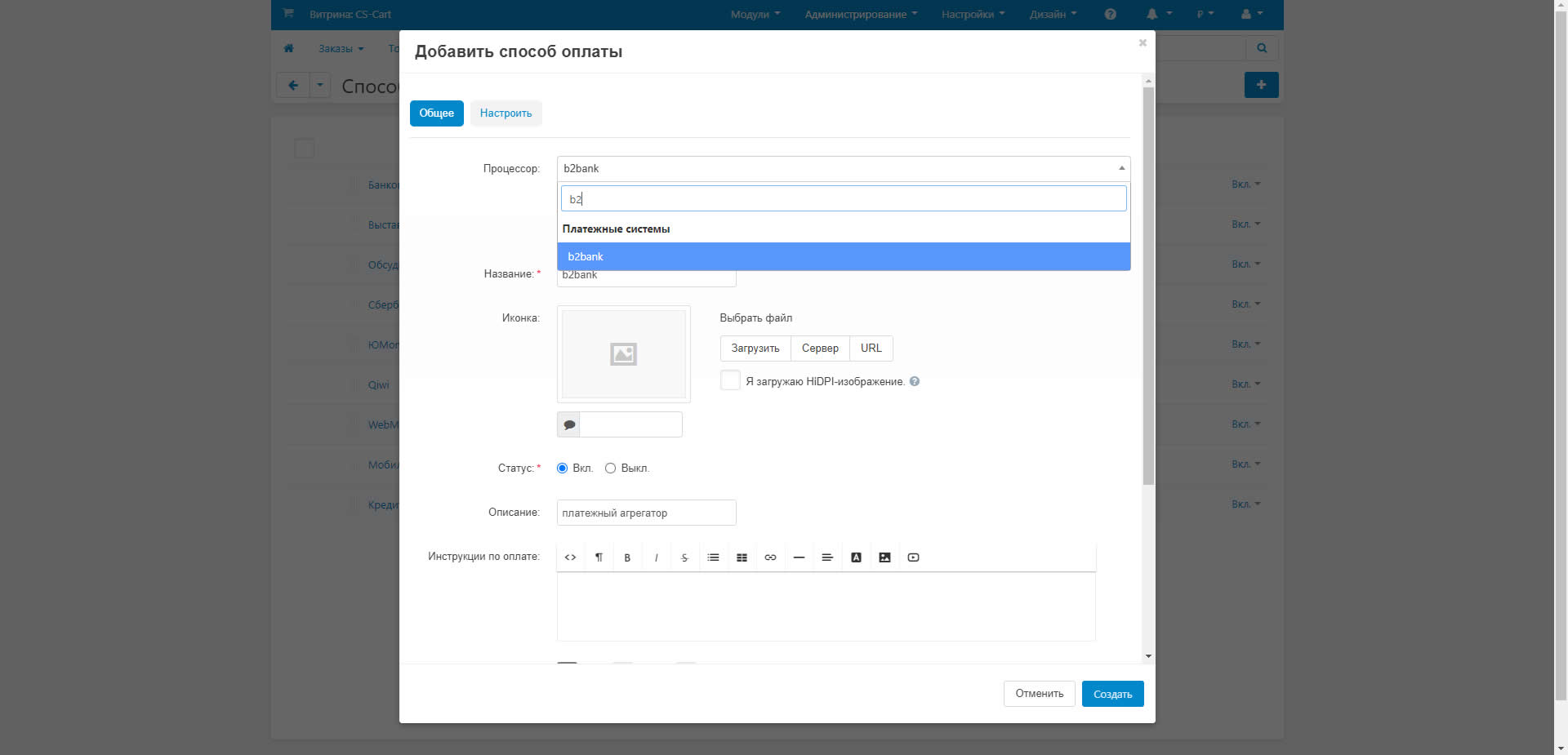 В поле Процессор введите - b2bank.Выберите данный способ оплаты.Перейдите на вкладку - Настройки.Введите значения - Идентификатор HashID,Идентификатор SiteID взятые с Вашей панели управления на сайте b2bank.ru.Сохраните изменения.
