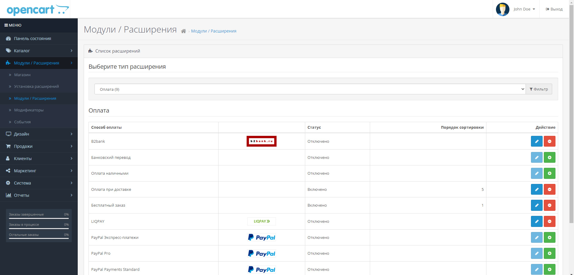 Перейдите в раздел - Модули / Расширения.Выберите тип расширения оплата.На экране Вы увидите способ оплаты b2bank.На данной странице выполлните действие - Активировать(тип оплаты b2bank)и затем нажмите на кнопку - Редактировать способ оплаты