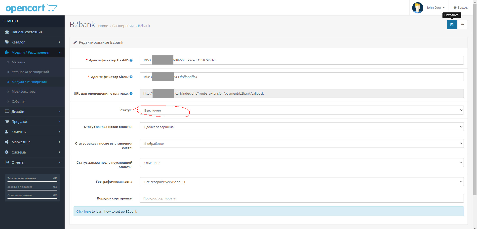 На странице настроек способа оплаты - b2bank необходимо внести и сохранить несколько изменений.